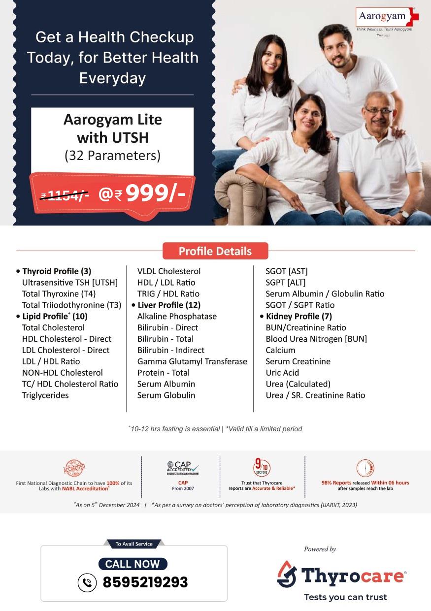 Thyrocare Aarogyam Lite with uTSH is a budget-friendly health checkup package designed to cover all the basic yet essential blood tests required for routine screening. It includes 32 parameters, covering ultra-sensitive TSH (uTSH), Thyroid Profile, Liver & Kidney Function, Lipid Profile.