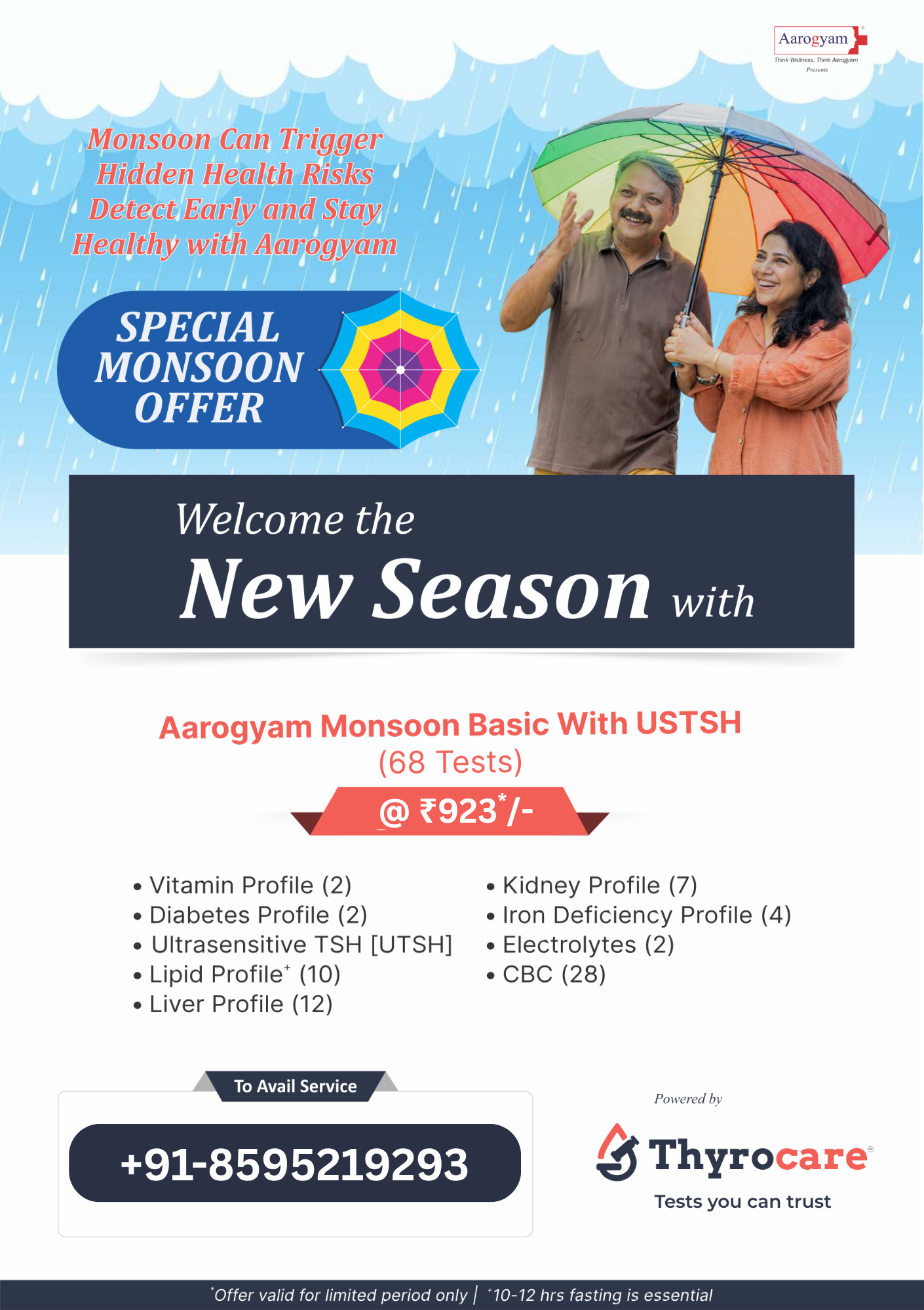 The Aarogyam Monsoon Basic with USTSH is a preventive health screening package designed to detect common infections and health issues that are more prevalent during the monsoon season.