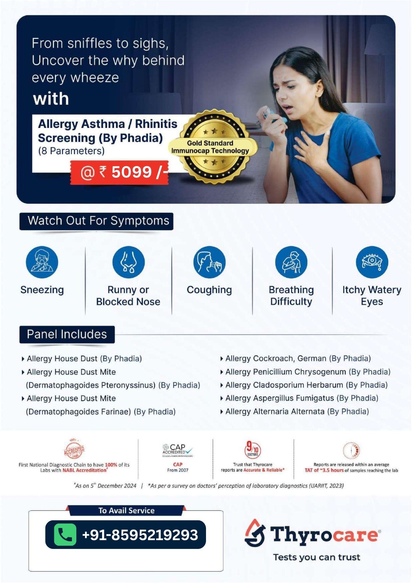 The Allergy Asthma/Rhinitis Screening (by Phadia) is a specialized blood test designed to identify allergens that may trigger asthma or allergic rhinitis. Using advanced Phadia allergy testing technology, this screening helps detect sensitivities to common environmental and food allergens that can cause symptoms such as sneezing, nasal congestion, wheezing, breathlessness, and coughing. Identifying these triggers supports better allergy management, symptom prevention, and long-term respiratory health. We at BookMyTest offers health checkup packages at a low price. We offer sample collection services at your home.