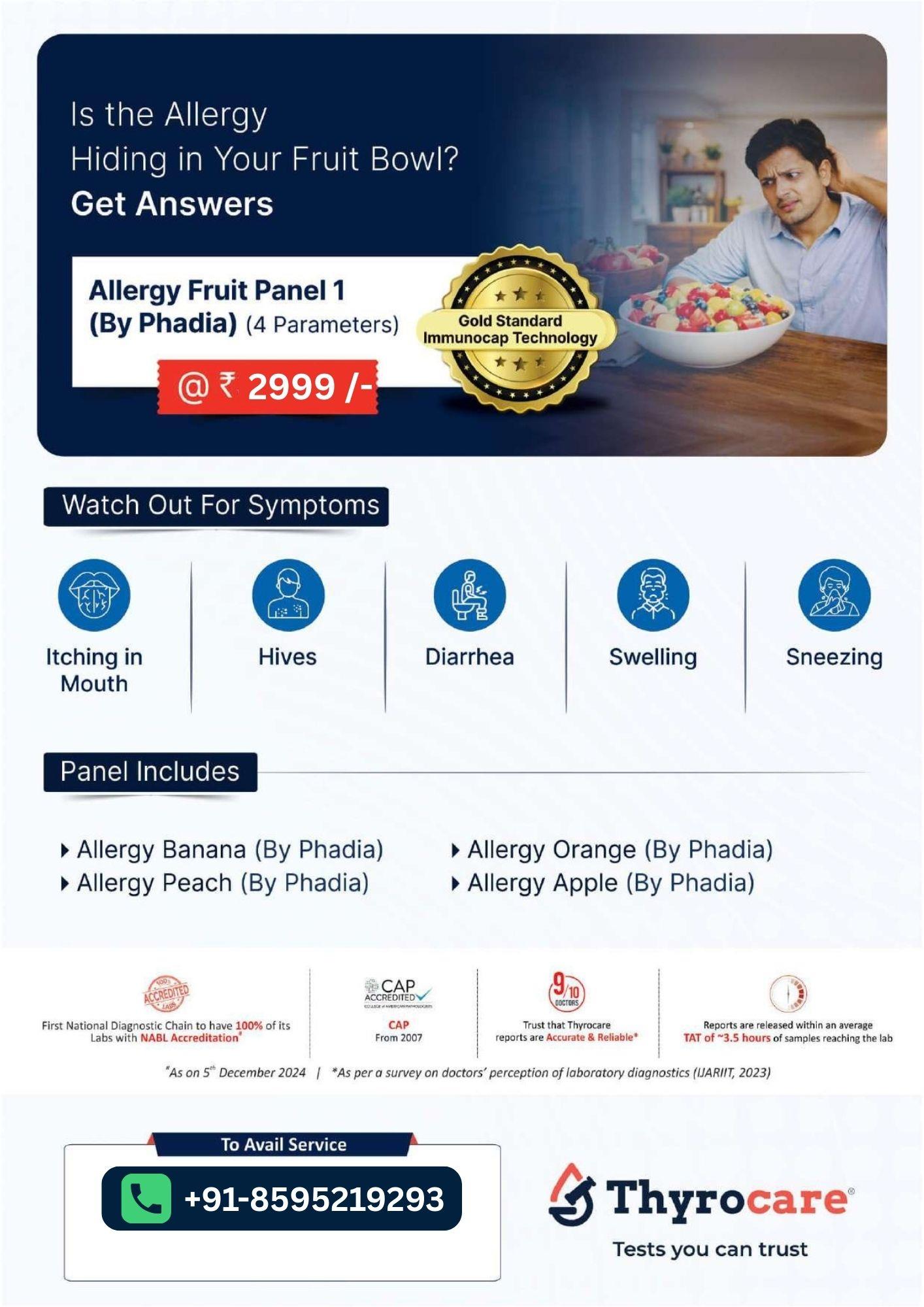 The Allergy Fruit Panel 1 (by Phadia) is a specialized blood test designed to identify allergic reactions to commonly consumed fruits. Using advanced Phadia allergy testing technology, this panel checks sensitivity to fruits such as banana, peach, orange, and apple, helping detect specific food triggers responsible for allergic symptoms. Identifying these fruit-related sensitivities supports safer dietary choices, effective allergy management, and prevention of repeated allergic reactions. We at BookMyTest offers health checkup packages at a low price. We offer sample collection services at your home.