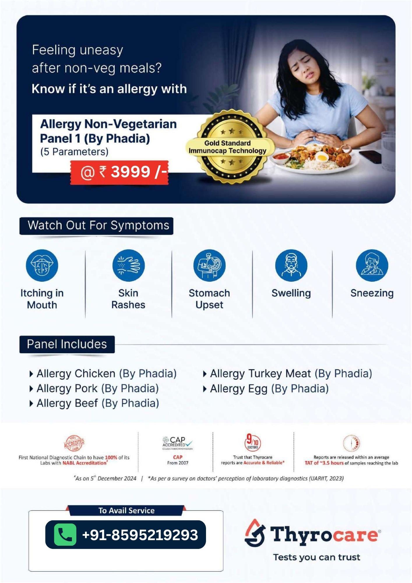 It is a blood test that detects allergies to selected non-vegetarian food items using Phadia technology.