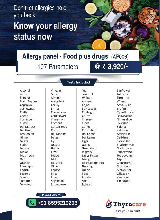 Thyrocares ALLERGY PANEL - FOOD PLUS DRUG helps you know about foods and drugs they may be allergic to or trigger unusual bodily reactions. It identifies specific food and drug allergens and provides details about the comprehensive list of foods and drugs to be avoided.