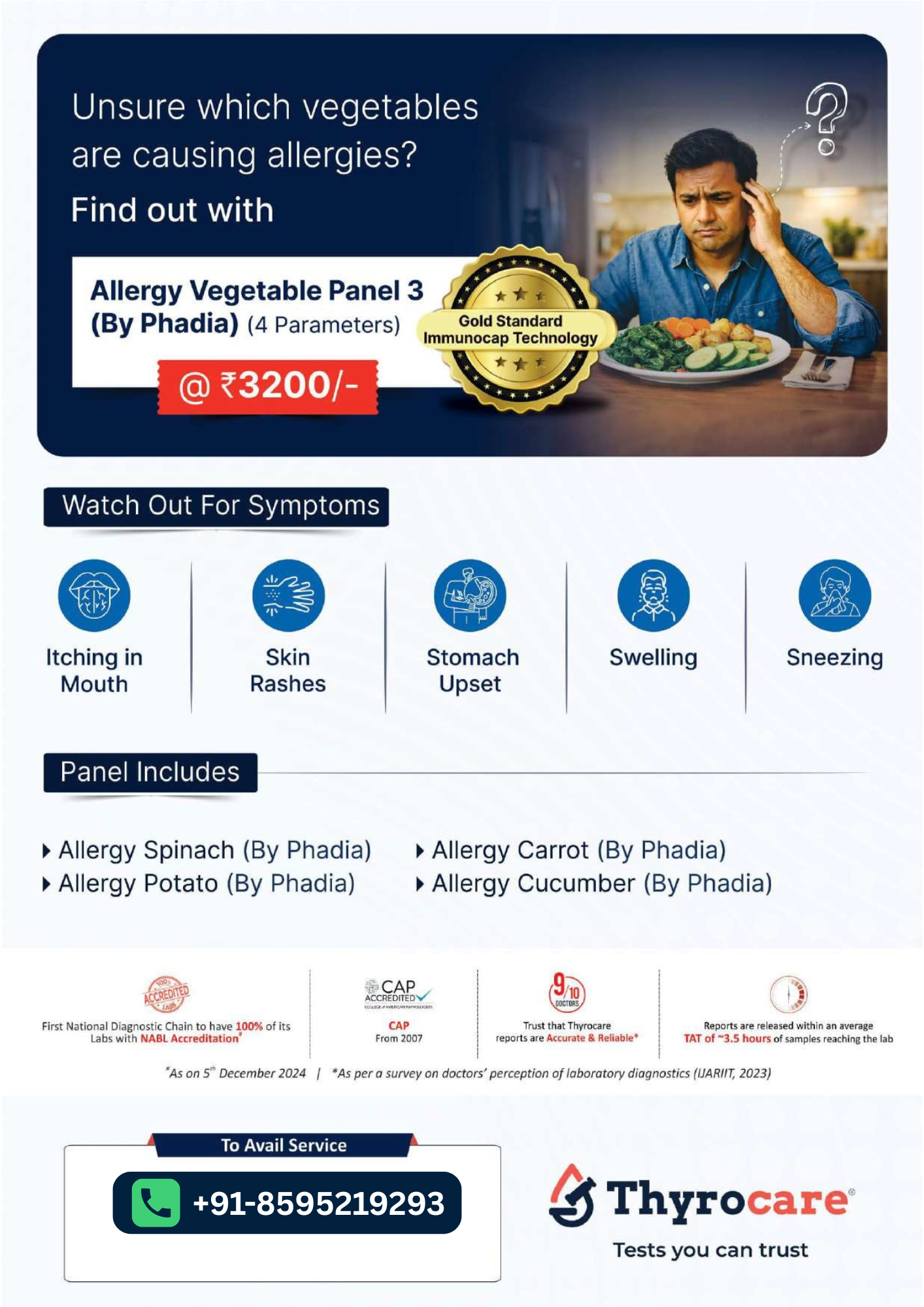 Allergy Vegetable Panel 3 (by Phadia) helps identify allergies to commonly eaten vegetables. It checks sensitivity to spinach, tomato, carrot and cucumber, helping detect food-related allergy triggers. This test is useful for people who experience symptoms like itching, rashes, sneezing or stomach discomfort after meals. Book the Allergy Vegetable Panel 3 test with BookMyTest at a low price with FREE home sample collection.