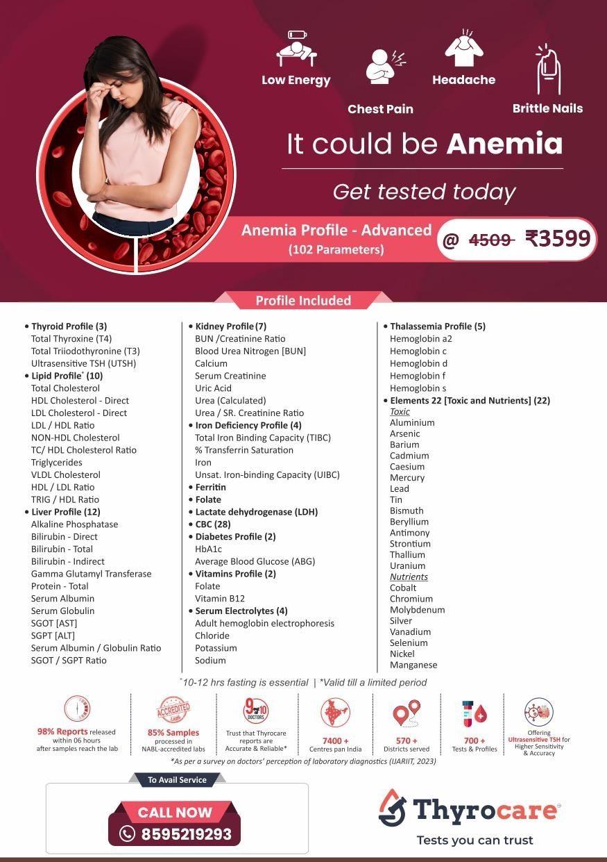 The cost of the Thyrocare Anemia Profile Advanced test varies by location and ongoing offers. Visit our website or contact us for the latest pricing and discounts.
