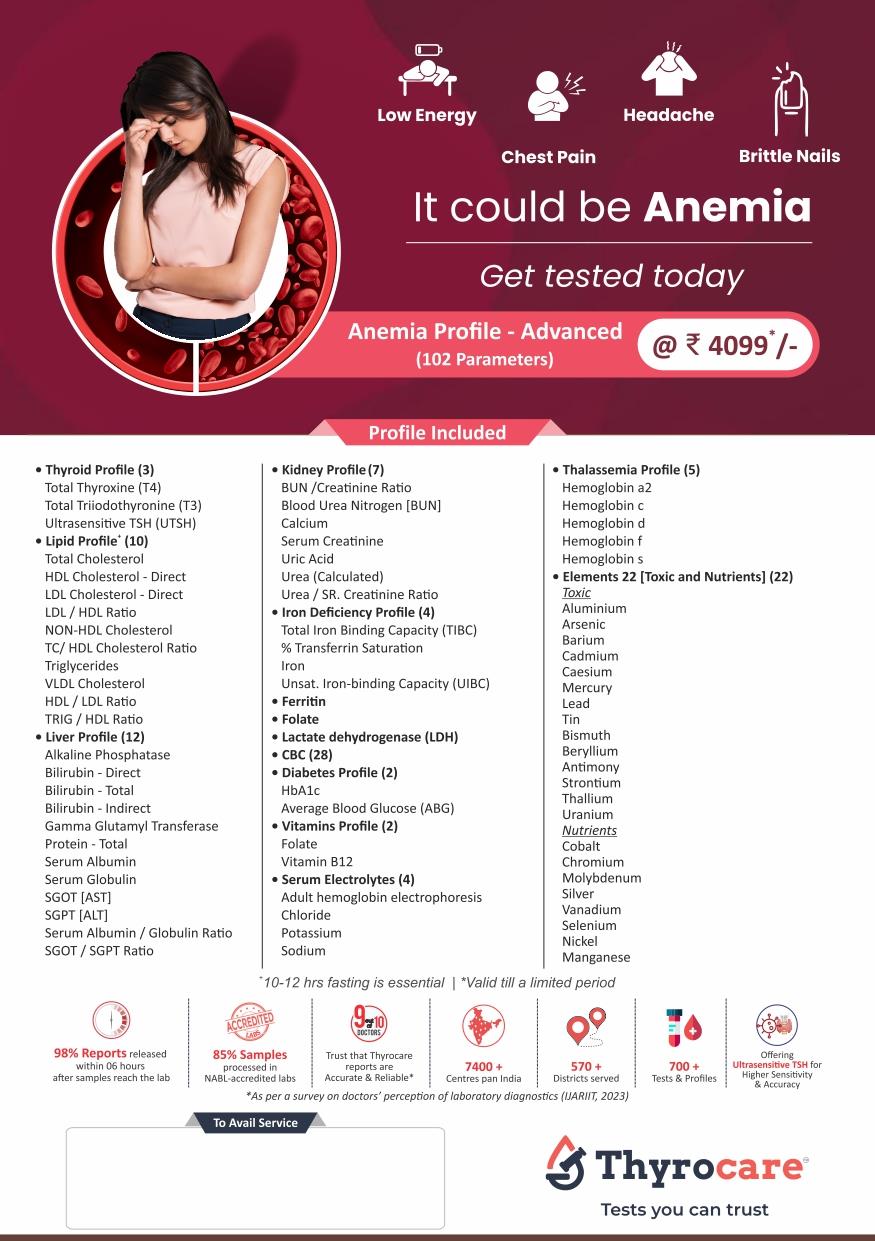 The Anemia Profile Advanced by Thyrocare is a comprehensive diagnostic test package that evaluates essential parameters like iron levels, vitamin B12, and folate to detect anemia and its underlying causes.