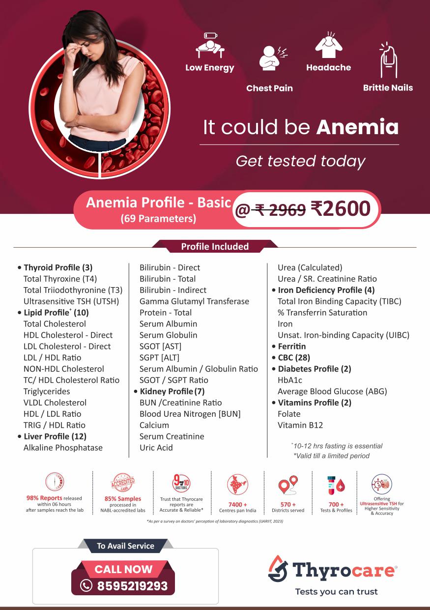 Thyrocare Anemia Profile Basic is the health check-up package. Anemia profile basic consist of 69 tests basic health check up profiles that include Thyroid Profile, Iron Deficiency Profile, Liver Profile, Lipid Profile, Kidney Profile, Diabetic , Complete Hemogram, Vitamins, Folate etc. We at Bookmytest offers health checkup packages at a low price. We offer Free home sample mcollection.