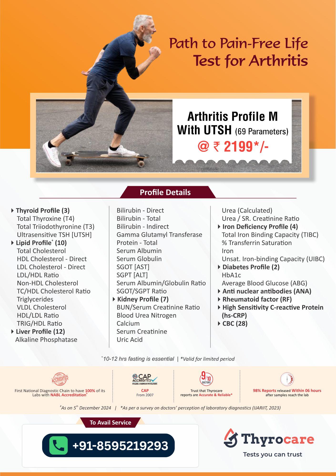 Arthritis Profile M with UTSH is a mid-range diagnostic package designed to offer a balanced and comprehensive analysis of one’s joint health. This profile is useful for individuals experiencing joint pain, swelling, stiffness, or knee discomfort, helping in early detection and monitoring of arthritis-related conditions. It is also recommended for people with a family history of degenerative or inflammatory joint disorders. Book the Arthritis Profile M with UTSH with BookMyTest at a low price with FREE home sample collection.