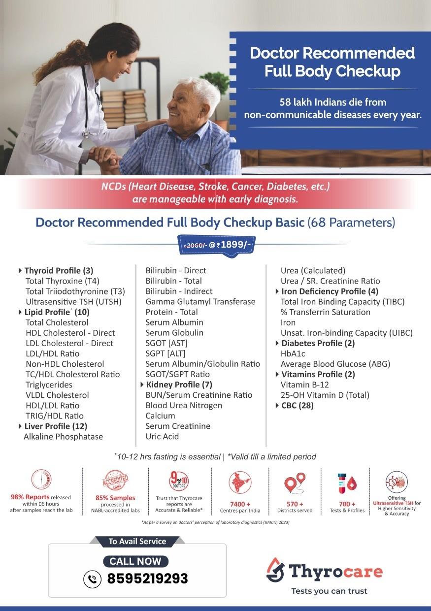 Thyrocare Doctor Recommended Full Body Checkup Basic is a comprehensive health screening package curated by medical experts for early detection of lifestyle disorders and general health risks. It includes 68 essential tests covering Complete Blood Count (CBC), Liver Function, Kidney Function, Lipid Profile, Blood Sugar (Fasting), Thyroid (TSH) and more.