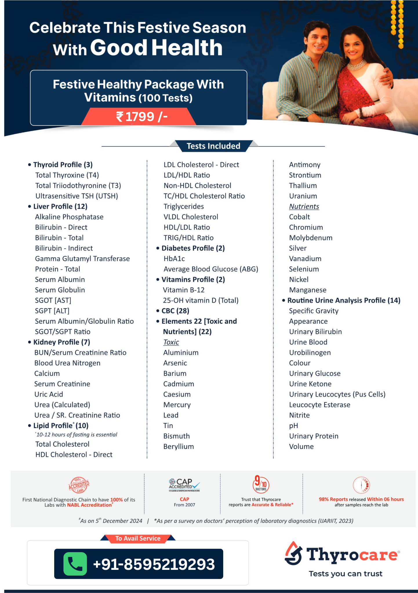This festive season, celebrate good health with our Festive Healthy Package with Vitamins. This specially designed preventive health checkup includes 100 parameters covering Complete Urine Analysis, Diabetes screening, Complete Blood Count (CBC), Kidney function, Lipid profile, Liver function, and Thyroid tests to help detect health risks at an early stage. It also checks vitamin levels and screens for toxic elements in the body, supporting better long-term wellness. We at Bookmytest offers health checkup packages at a low price. We offer sample collection services at your home.