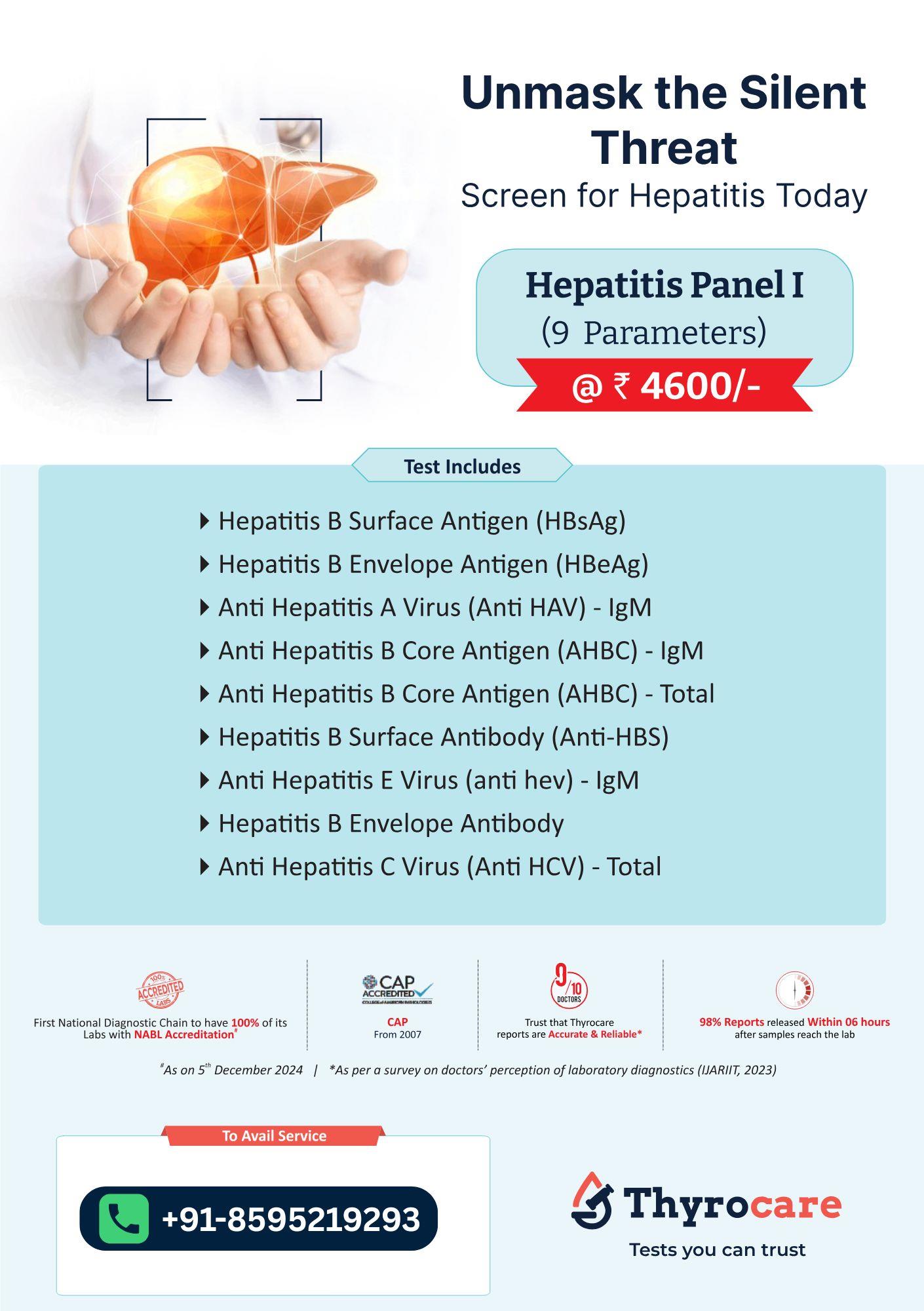 The Hepatitis Panel I is a focused diagnostic profile comprising 9 essential tests to screen for Hepatitis A, B, and C infections. It includes markers like HBsAg, Anti-HAV, Anti-HCV and others that help detect both current and past infections. This panel is recommended for individuals with liver symptoms, high-risk exposure, or as part of routine screening. Book the Hepatitis Panel I test with BookMyTest at a low price with FREE home sample collection.