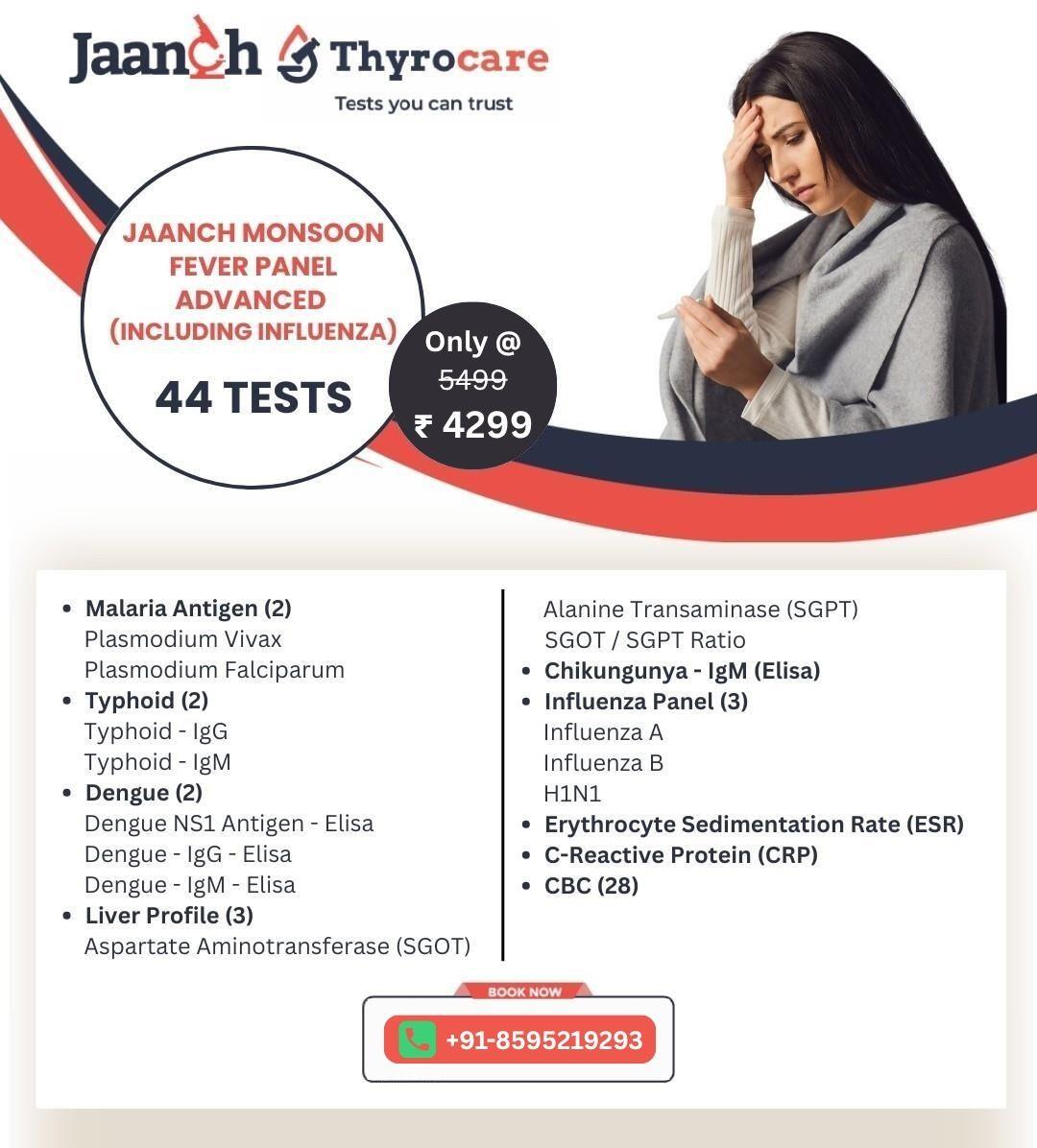 Thyrocare’s Monsoon Fever Panel Advanced includes a broad range of tests to identify common monsoon-related infections such as Dengue, Malaria, Typhoid, Leptospirosis, Influenza (A & B), along with essential blood parameters like CBC, ESR, and CRP.