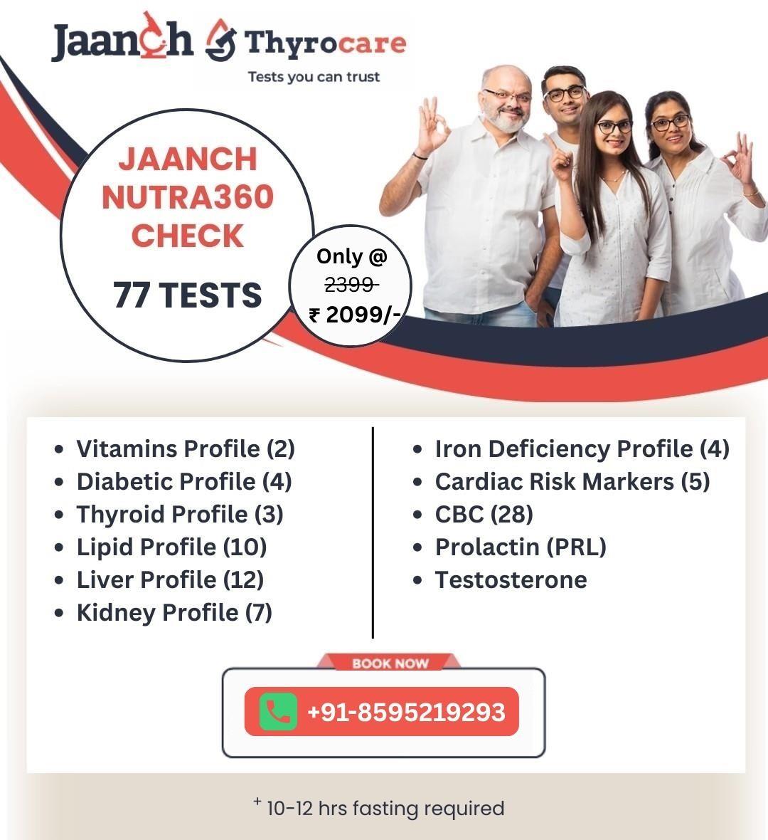 Thyrocare’s JAANCH – Nutra360 Check is a comprehensive nutritional health screening that evaluates vitamin levels, mineral deficiencies, metabolic markers, and essential health parameters, offering a 360-degree view of your nutritional well-being.
