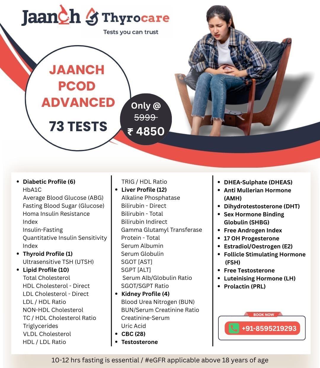 Jaanch - PCOD Advanced includes important blood tests that help diagnose and understand the severity of PCOD in girls and women. Consisting of 73 parameters, the profile evaluates the levels of multiple hormones in your body like Follicular Stimulating Hormone (FSH), Luteinizing Hormone (LH), Prolactin and Testosterone important for maintaining reproductive health. If detected early, PCOS can be managed better to prevent severe health conditions like diabetes and abnormal blood pressure. These hormones are curated by doctors exclusively for your menstruation cycles and pregnancies. Book now & get Free home sample collecttion.