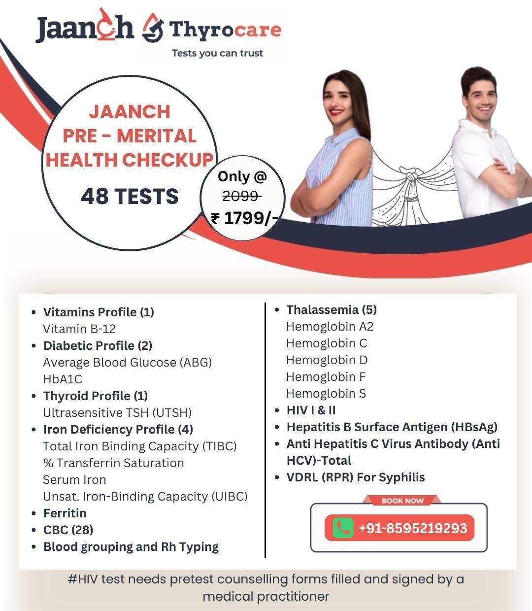Thyrocare Jaanch - Pre-Marital Health Check up It includes 48 basic tests to check Diabets, Vitamin B12 levels, Thyroid Function and more. The package also includes important test Thalassemia, Hiv, Infectious, blood RH typing, hepatitis. Book Jaanch - Pre-Marital check up from bookmytest Get FREE home sample collection.
