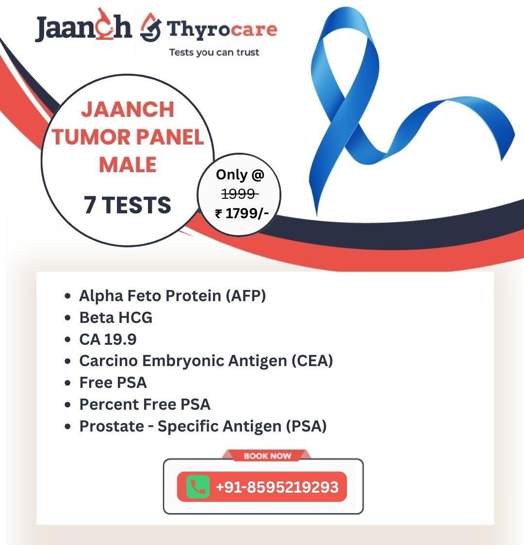 The Thyrocare Jaanch Tumour Marker Panel (Male) is priced at RS 1,799. This cost includes all 7 tumour marker tests, home sample collection, and delivery of a digital report via SMS and email. It is an affordable solution for men seeking reliable and preventive cancer screening.