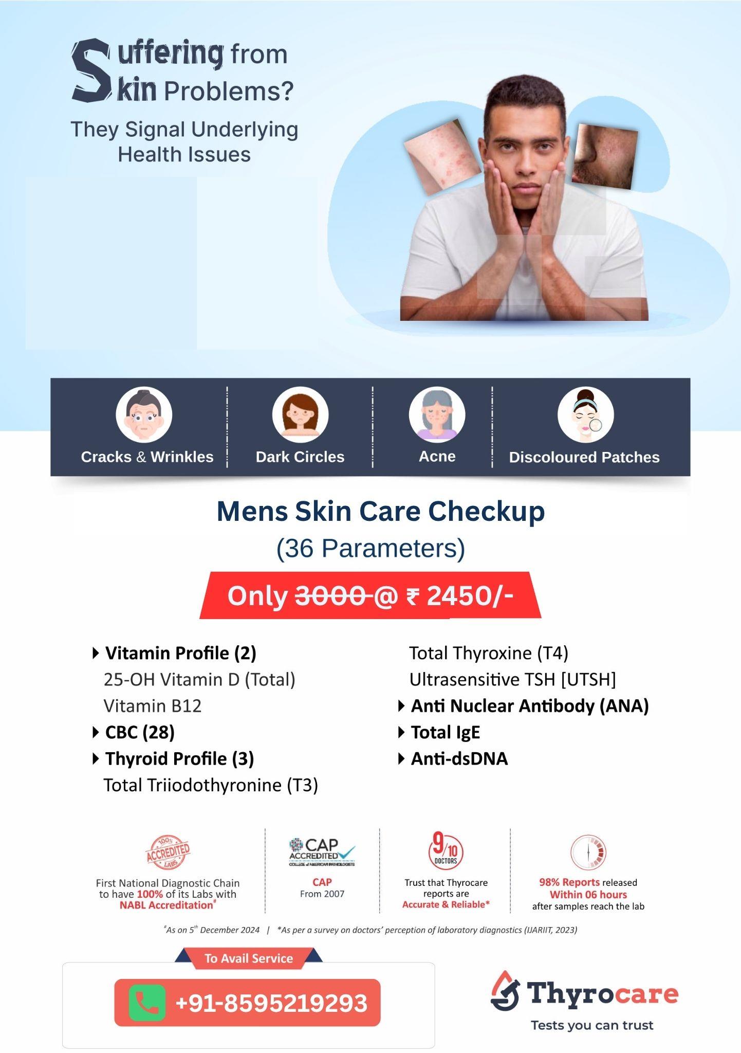 Thyrocare is a well-established name in preventive health diagnostics, offering trusted testing services backed by over two decades of experience. With nationwide reach, NABL and ISO-certified laboratories, and fully automated systems, Thyrocare guarantees precision, safety, and reliability. The Men’s Skin Care Checkup Package is a specially designed offering that helps men understand how int