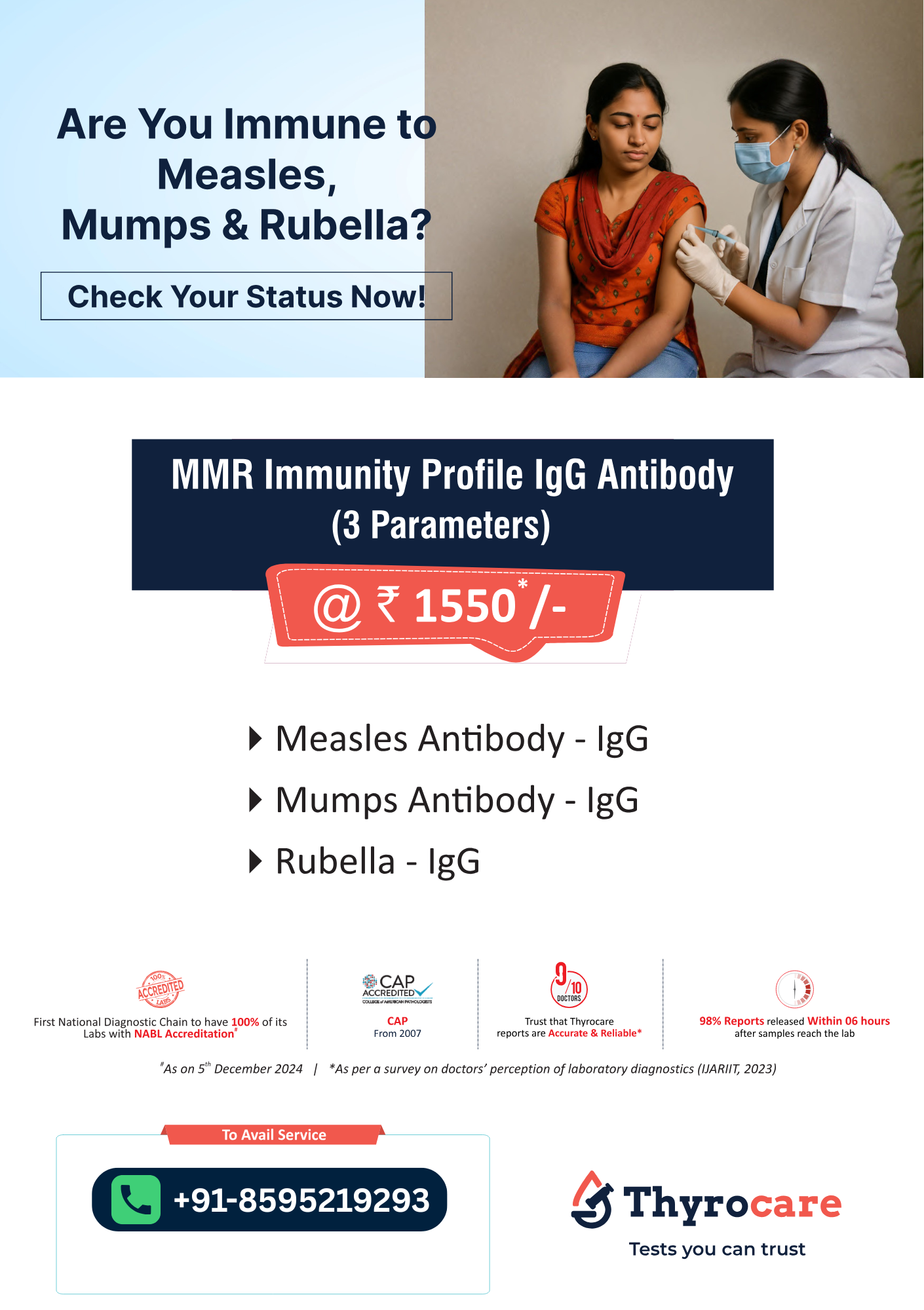 The MMR Immunity Profile IgG Antibody test is a blood test that checks whether your body has protective immunity against Measles, Mumps, and Rubella (MMR). It measures IgG antibodies, which indicate past infection or vaccination response and help confirm if you are protected. This test is useful for people unsure about their vaccine history, planning pregnancy, healthcare workers, or individuals needing immunity proof for travel, work, or school. It helps identify whether a booster vaccination may be needed. Book the MMR Immunity Profile test with BookMyTest at a low price with FREE home sample collection.
