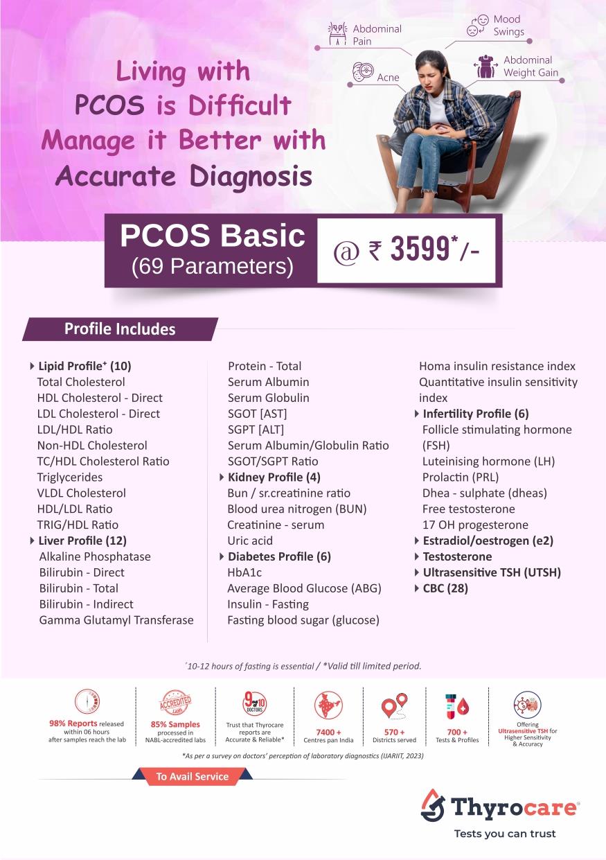 Book the PCOS Basic Test Package online From Thyrocare & get free home sample collection across India. All tests are processed in NABL/ISO-certified labs, delivering accurate and timely results for better reproductive health management.