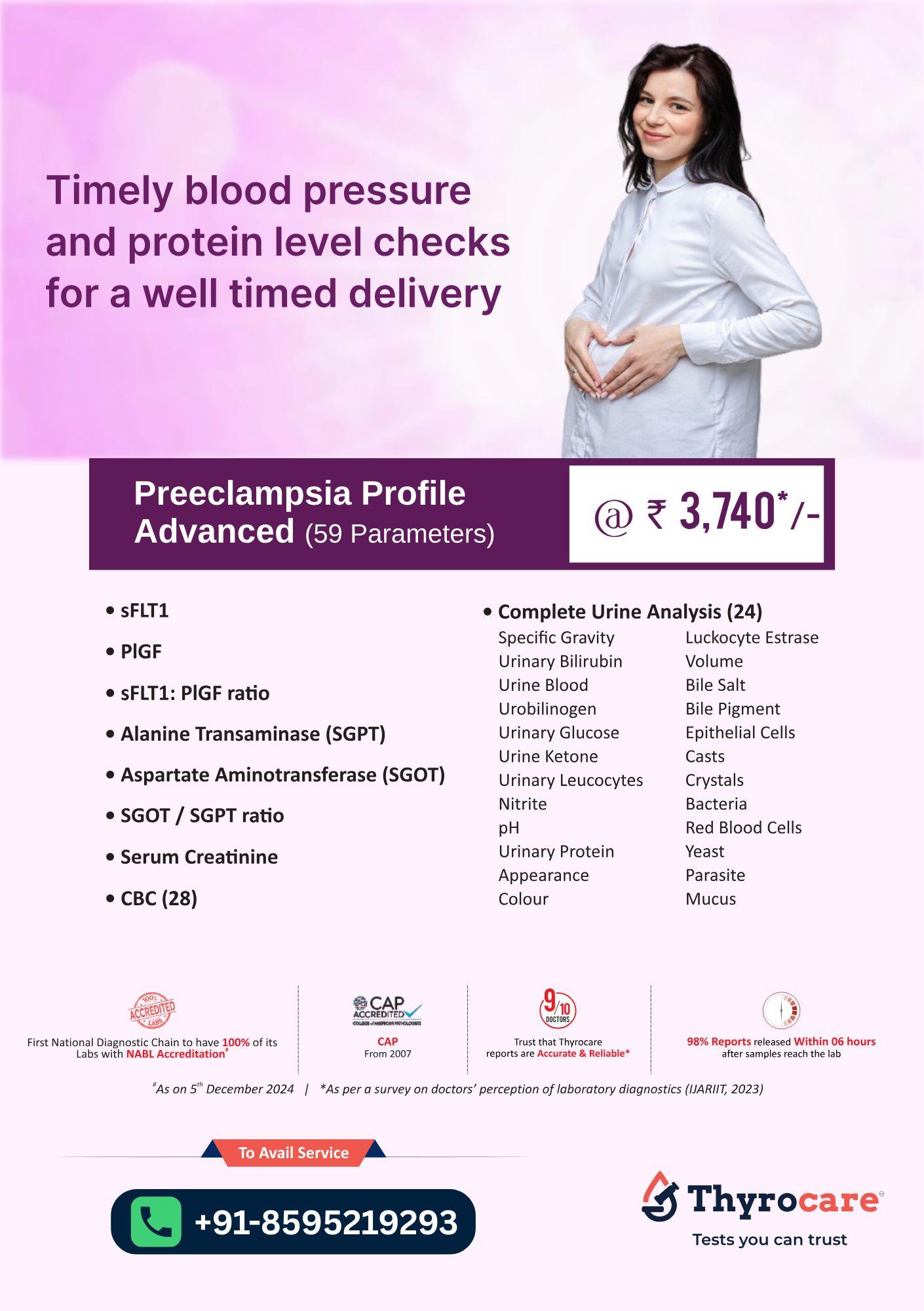 Preeclampsia is a pregnancy disorder that involves high blood pressure, proteinuria (protein in urine) and possible organ damage. Preeclampsia Profile Advanced is recommended for pregnant women in the 2nd and 3rd trimesters. It includes blood and urine marker tests (sFLT1 and PlGF) to predict preeclampsia risk. An elevated sFLT1:PlGF ratio, combined with other clinical factors, indicates a higher possibility of preeclampsia and eclampsia during pregnancy. It also includes complete urine analysis, which helps identify minor fluctuations that may contribute to preeclampsia conditions. Early detection supports timely medical care and helps protect both mother and baby. Book the Preeclampsia Profile Advanced test with BookMyTest at a low price with FREE home sample collection.