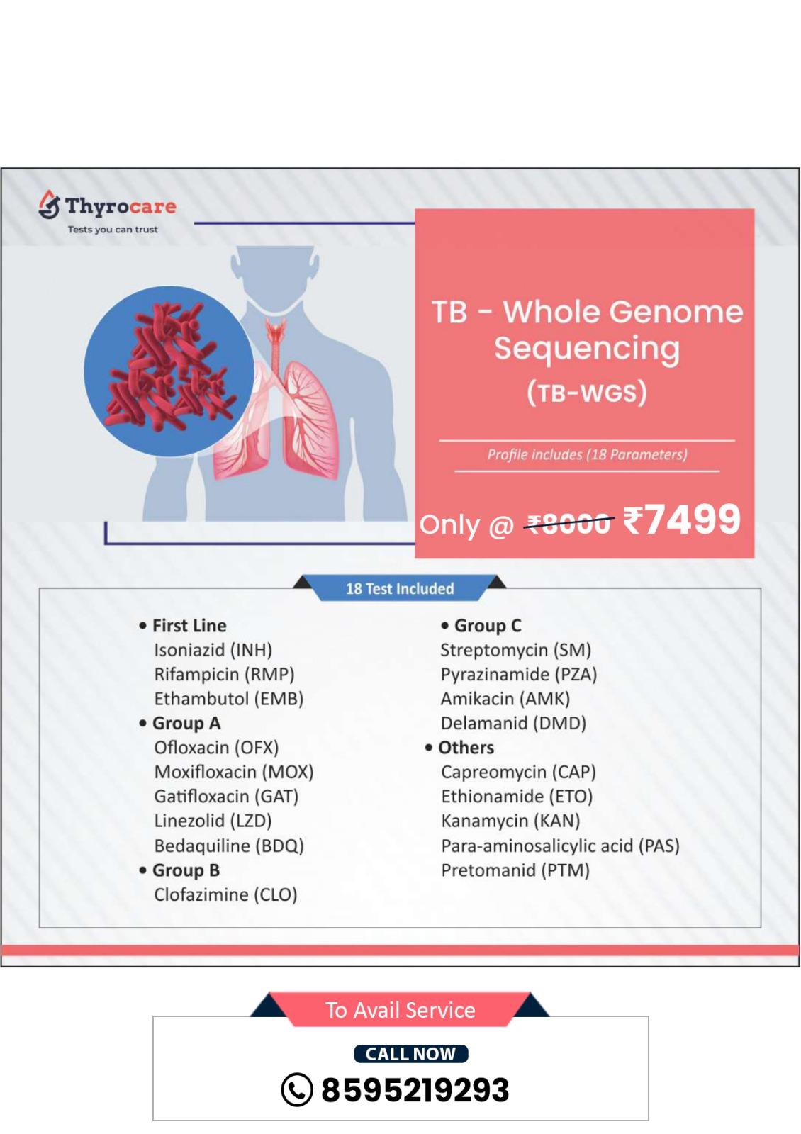 Thyrocare is a trusted leader in preventive diagnostics, offering state-of-the-art technology, nationwide reach, and fully automated testing under NABL and CAP accreditation. The TB Whole Genome Sequencing test by Thyrocare supports India’s mission to eliminate tuberculosis by providing early detection of drug resistance and enabling targeted therapy. Thyrocare combines clinical accuracy, affordability, and convenience, making it an excellent choice for advanced TB testing.