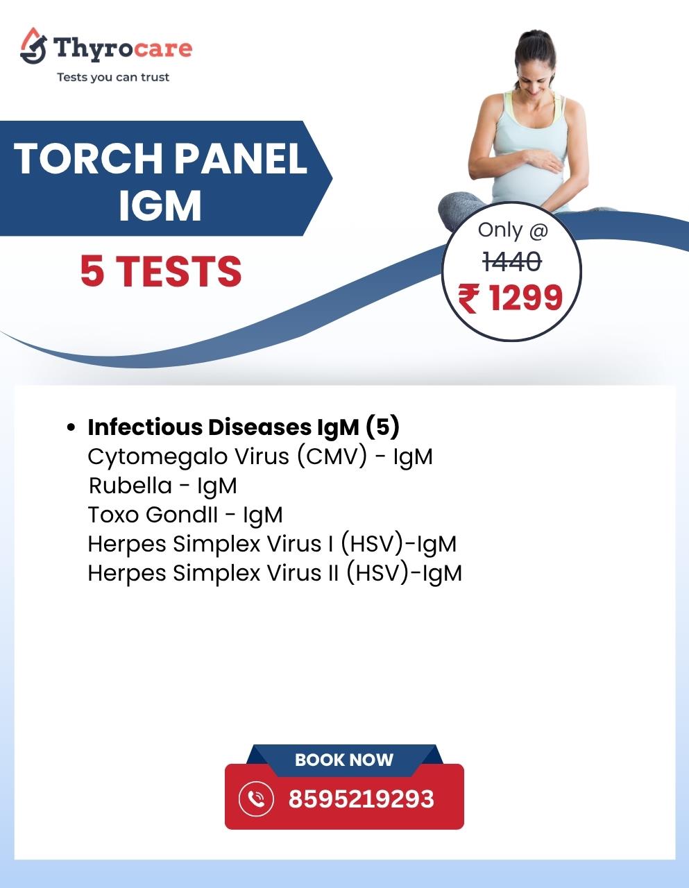 Ans. The TORCH IgM panel is a blood test that detects IgM antibodies against specific infections—Toxoplasma, Rubella, Cytomegalovirus (CMV), and Herpes Simplex Virus (HSV). These infections can pose risks during pregnancy if not identified and treated early.