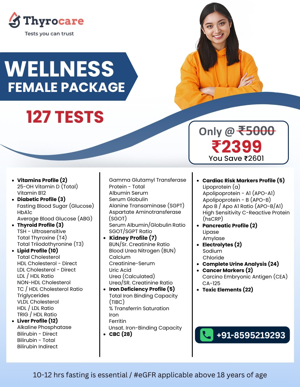 The Wellness Female Package is an advanced preventive health checkup designed for complete women’s wellness monitoring and early risk detection. Along with essential screening tests like CBC, diabetes, urine analysis, lipid profile, liver, kidney, thyroid, electrolytes and iron deficiency, it also includes Cardiac Risk Markers and Cancer Markers for deeper preventive evaluation. This package also covers pancreatic health and a detailed toxic elements profile, helping detect hidden risks related to lifestyle, environment and long-term exposure. It is ideal for women who want proactive health tracking, especially when stress, fatigue, weight changes, hormonal fluctuations or family history of diabetes and heart disease are present. Book the Wellness Female Package online with BookMyTest at a low price with FREE home sample collection.