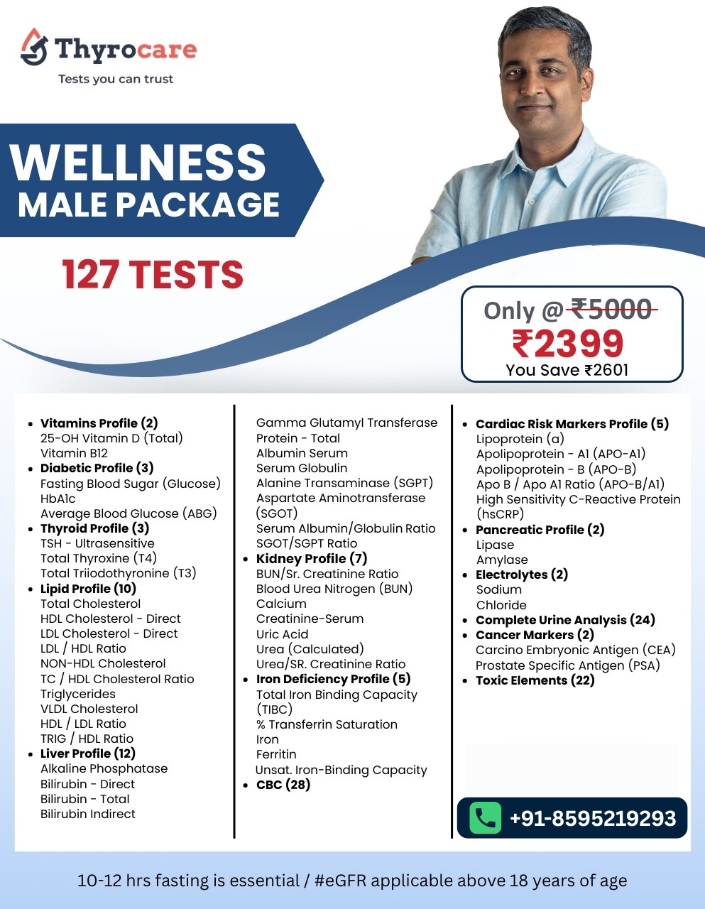 The Wellness Male Package is an advanced preventive health checkup designed for complete male wellness monitoring and early risk detection. Along with essential screening tests like CBC, diabetes, urine analysis, lipid profile, liver, kidney, thyroid, electrolytes, iron deficiency and vitamins, it also includes Cardiac Risk Markers and Cancer Markers for deeper preventive evaluation. This package also checks pancreatic health and a detailed toxic elements profile, helping identify hidden risks related to lifestyle, environment and long-term exposure. It is ideal for men with stressful routines, irregular lifestyle, fatigue, weight changes, or family history of diabetes and heart disease. Book the Wellness Male Package online with BookMyTest at a low price with FREE home sample collection.