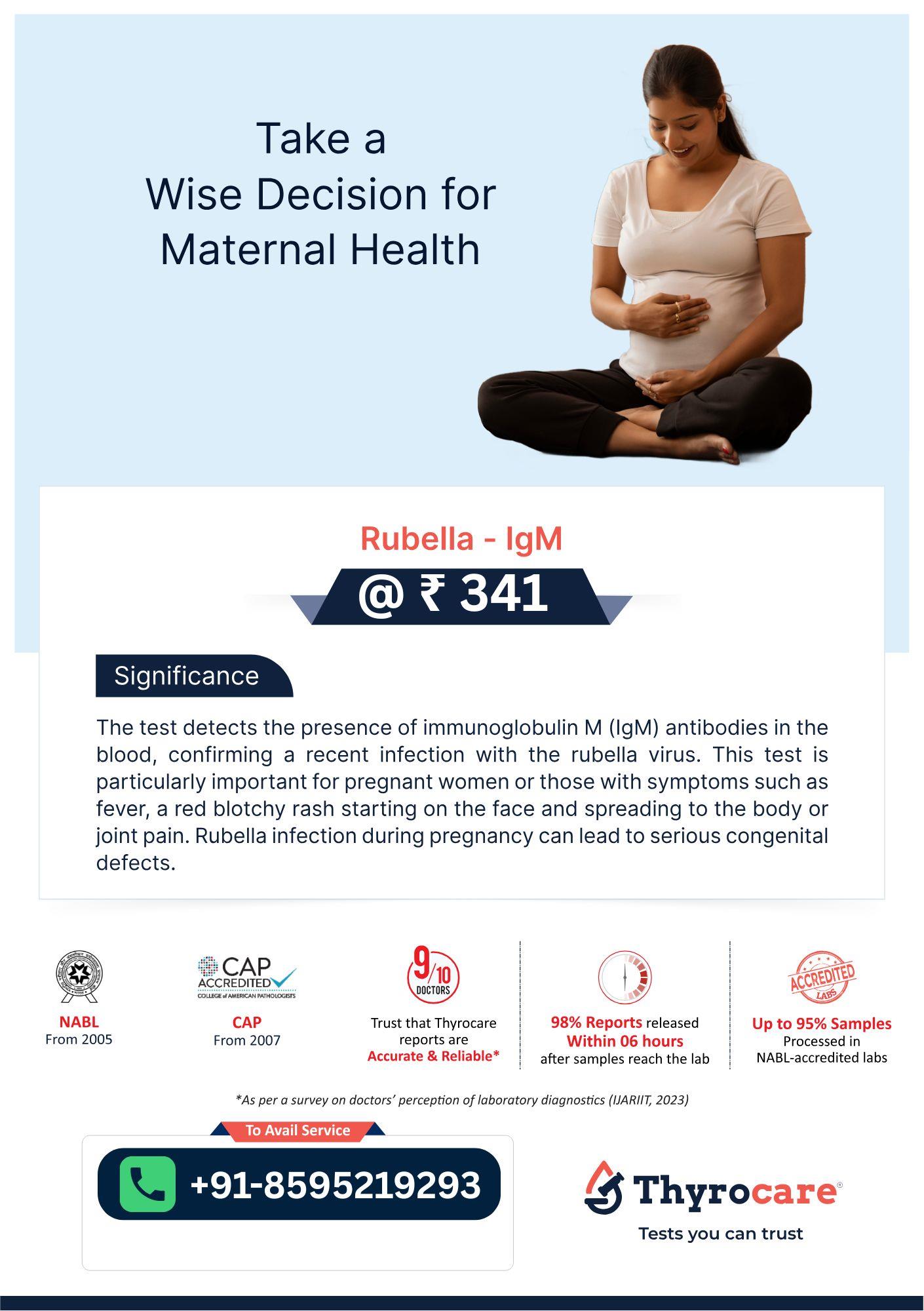 The Thyrocare Rubella IgM Test detects IgM antibodies in the blood, which helps diagnose a recent or active rubella (German measles) infection.