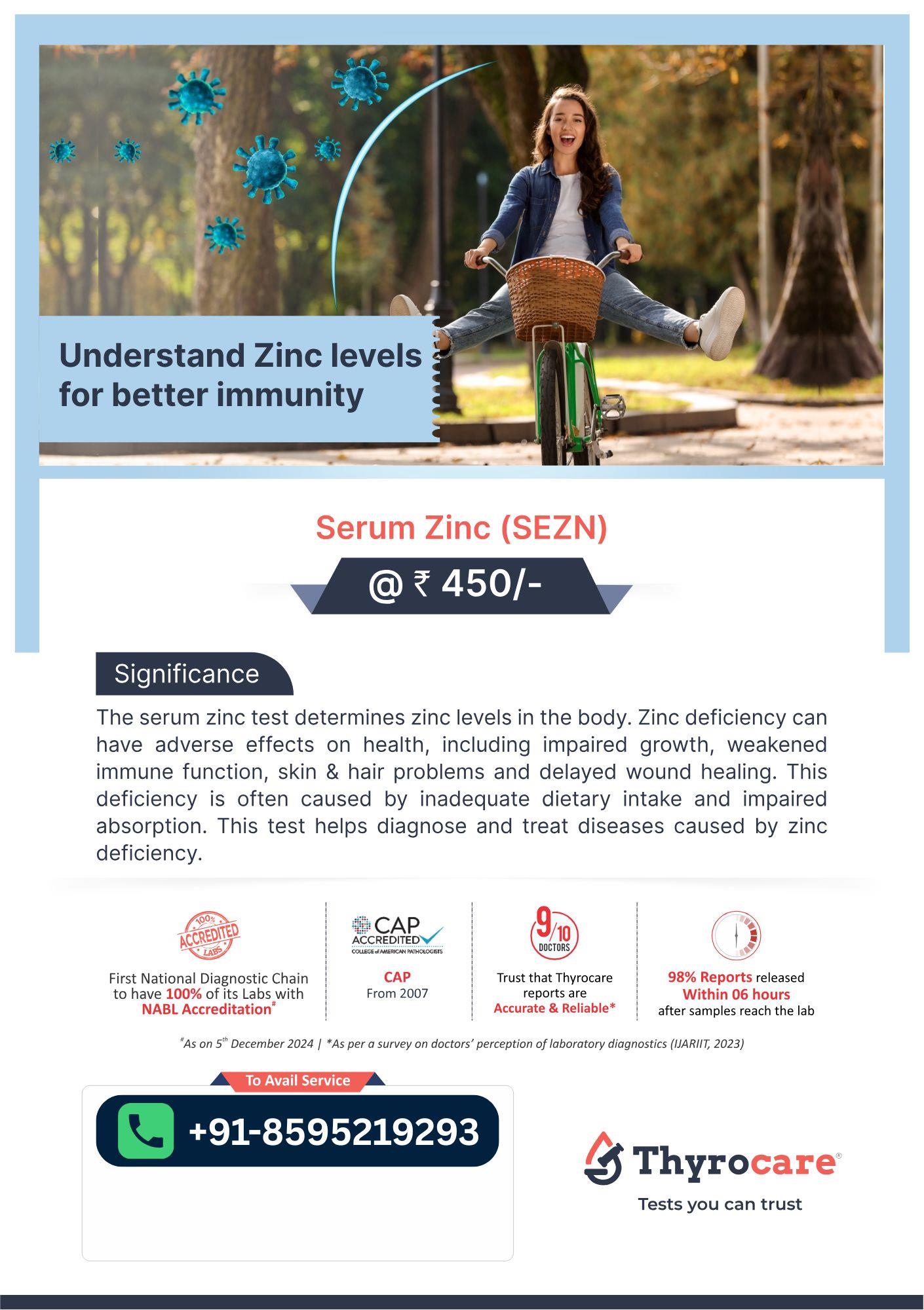 The Thyrocare Serum Zinc Test measures the level of zinc in your blood, which is essential for immune function, wound healing, cell growth, and overall metabolic health.