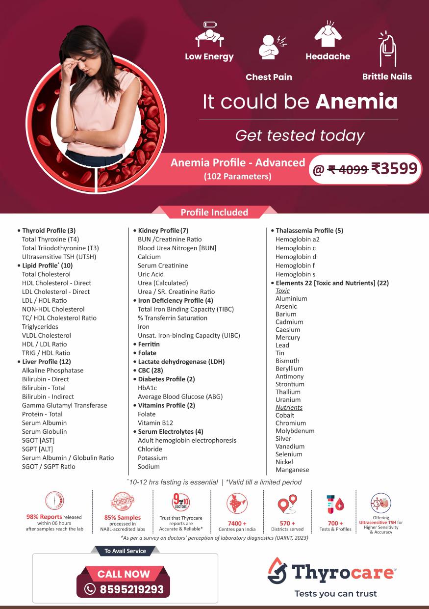 Thyrocare Anemia Profile is new Anemia checkup package from Thyrocare. It includes Many More tests and  profiles. The results of this test, which look at blood composition, Vitamin B12, folate and Iron help to diagnose anemia, and also monitor its treatment.  you can get it at an offer price with free home sample collection facilities