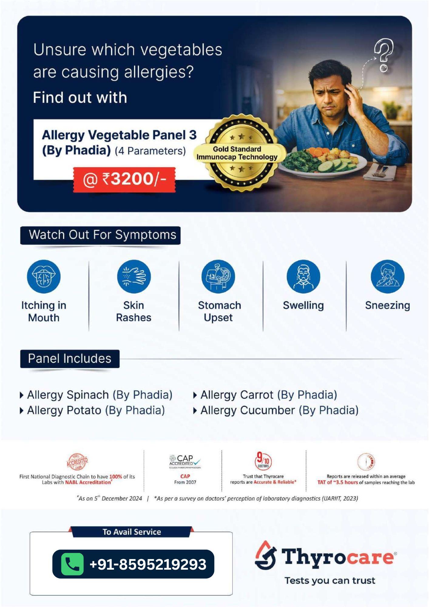 Allergy Vegetable Panel 2 (by Phadia) helps detect allergic reactions to selected vegetables. It checks sensitivity to tomato, spinach, cabbage and sweet pepper (paprika) to identify food triggers causing allergy symptoms like itching, rashes, sneezing or stomach discomfort. This test is helpful for people who experience repeated allergy symptoms after meals but are unsure of the exact trigger. Book the Allergy Vegetable Panel 2 test with BookMyTest at a low price with FREE home sample collection.