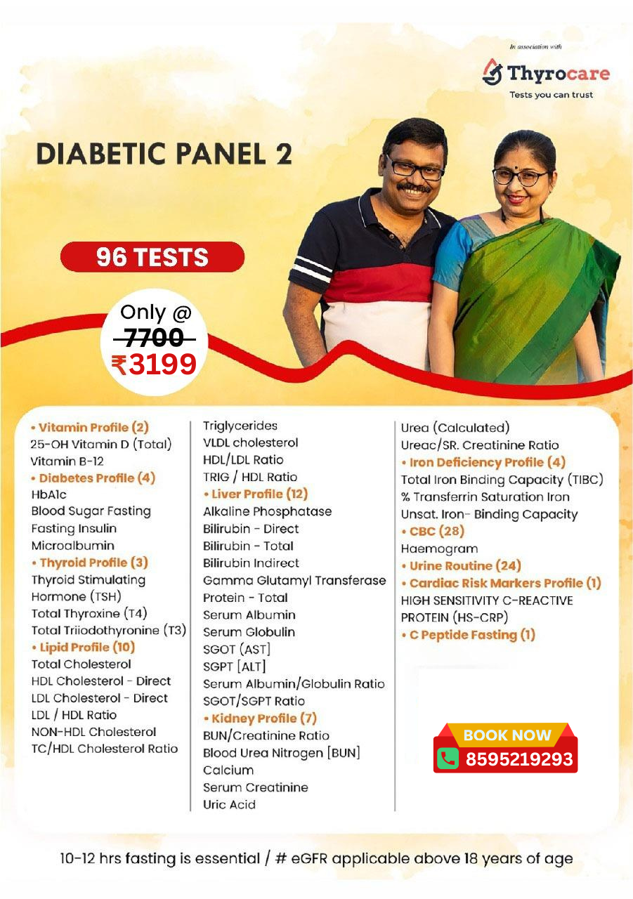 Diabetic Panel 2 is a preventive health checkup package designed to monitor blood sugar control and detect early risks related to diabetes. It includes key tests like Fasting Blood Sugar (FBS) and HbA1c, which help assess both current glucose levels and average sugar control over the last 2–3 months. This panel is ideal for people with diabetes, prediabetes, or those with a family history of high blood sugar. Regular testing helps track progress, prevent complications, and support timely lifestyle or treatment changes.