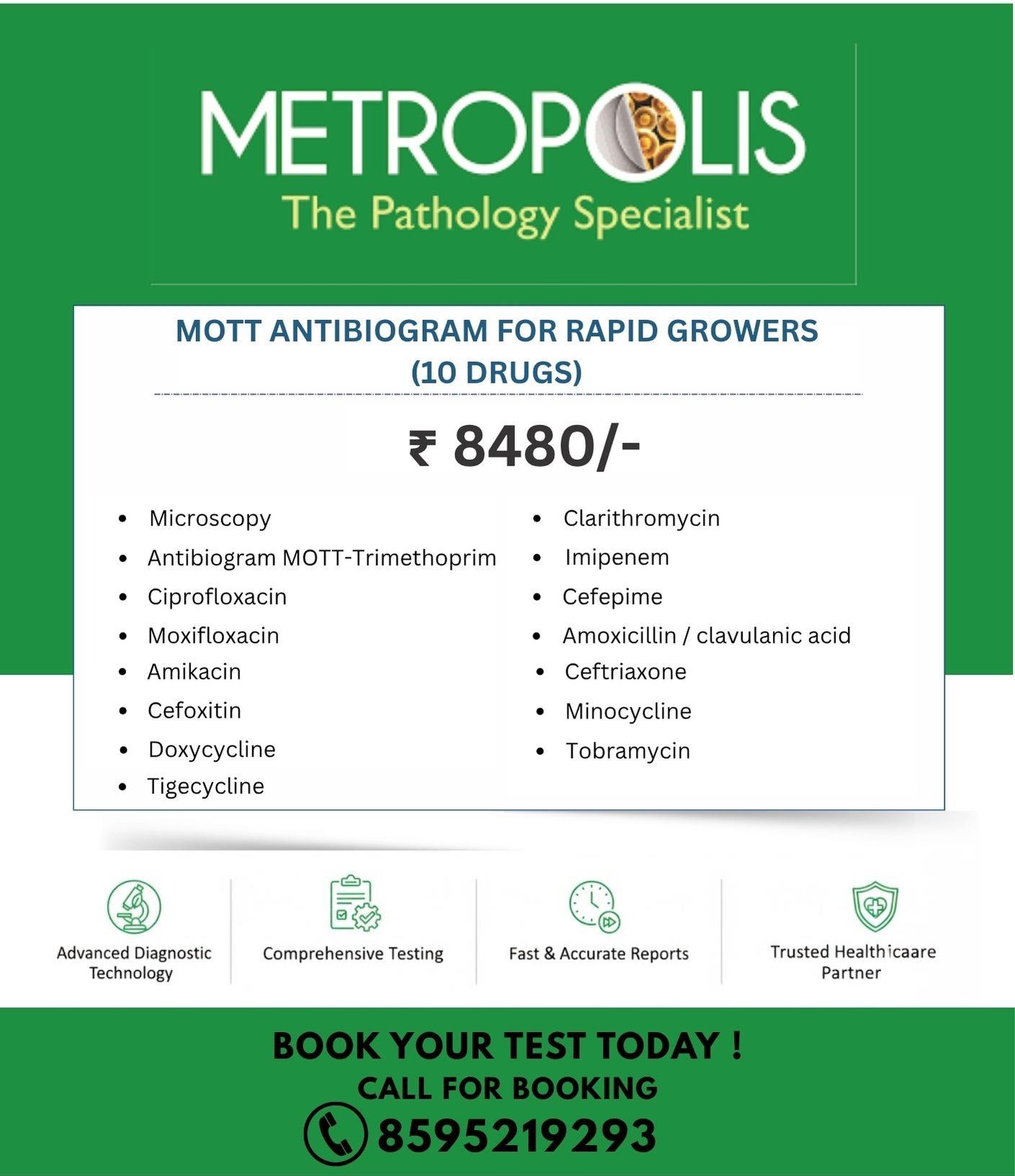 The MOTT Antibiogram for Rapid Growers (10 Drugs) test at Metropolis Healthcare determines the antibiotic susceptibility pattern of Mycobacteria Other Than Tuberculosis (MOTT) that grow rapidly. This test helps identify the most effective antibiotics for treating infections caused by these non-tuberculous mycobacteria (NTM). It is crucial for guiding targeted therapy and preventing drug resistance. Metropolis Healthcare uses advanced molecular and culture-based methods to ensure accurate, reliable, and clinically relevant results for optimal patient management.