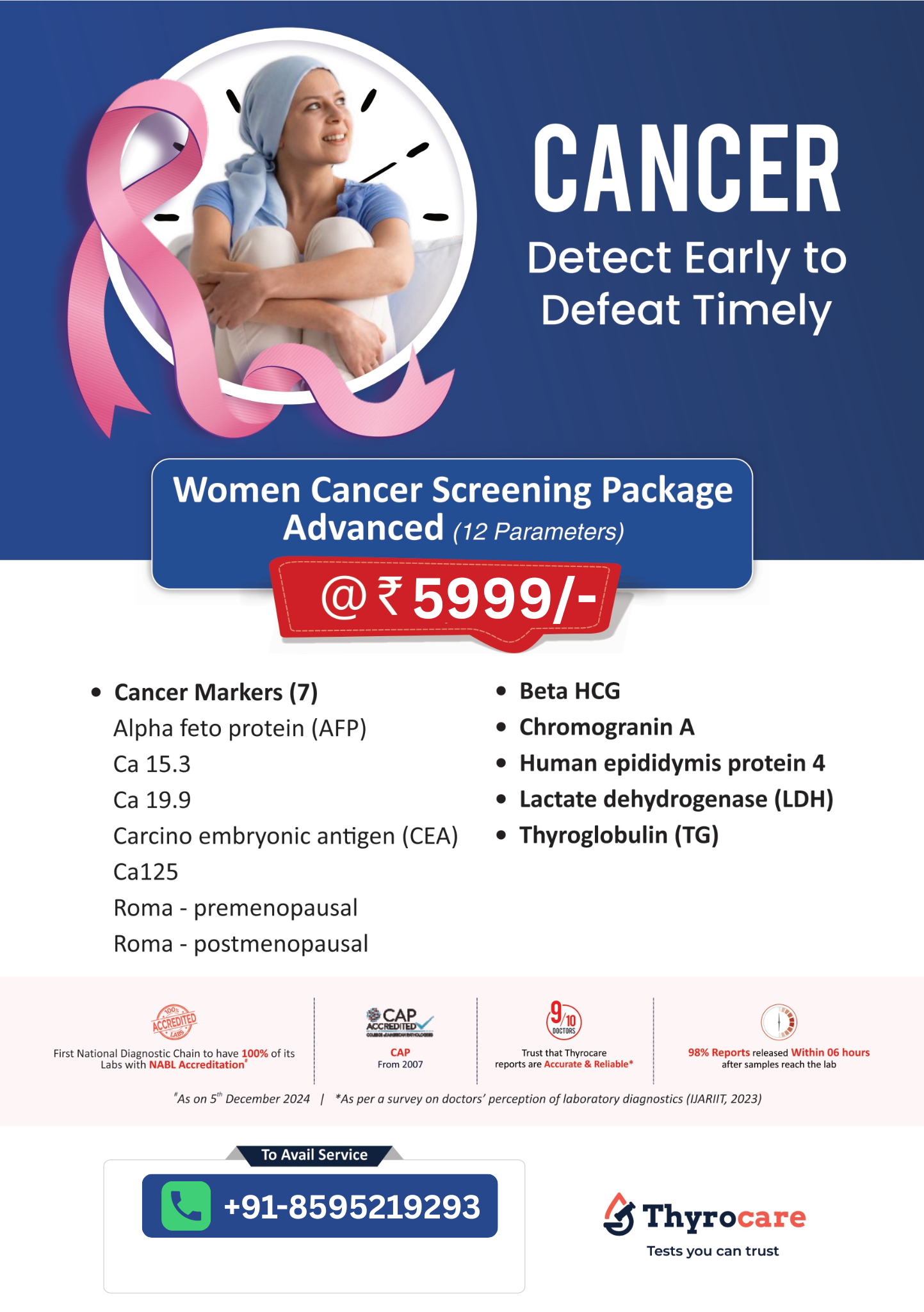 The Women Cancer Screening Package Advanced is a comprehensive diagnostic package designed for early detection and monitoring of common cancers affecting women. It includes multiple cancer markers such as CA-125, CA 15.3, B-HCG, CA 19.9, and HE4, which help assess risks related to ovarian, breast, endocrine, and other gynecological cancers. The package also includes the ROMA Index, which supports prediction of ovarian cancer risk, particularly in cases with ovarian or adrenal masses. Early screening through this profile enables timely medical evaluation, close monitoring, and improved health outcomes. We at BookMyTest offers health checkup packages at a low price. We offer sample collection services at your home.