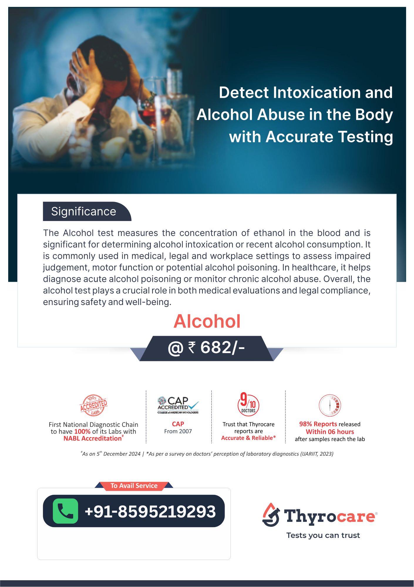 The Thyrocare Alcohol Test detects the presence of ethyl alcohol (ethanol) in the blood or urine. It is used to assess recent alcohol consumption and helps determine blood alcohol concentration (BAC) levels.
