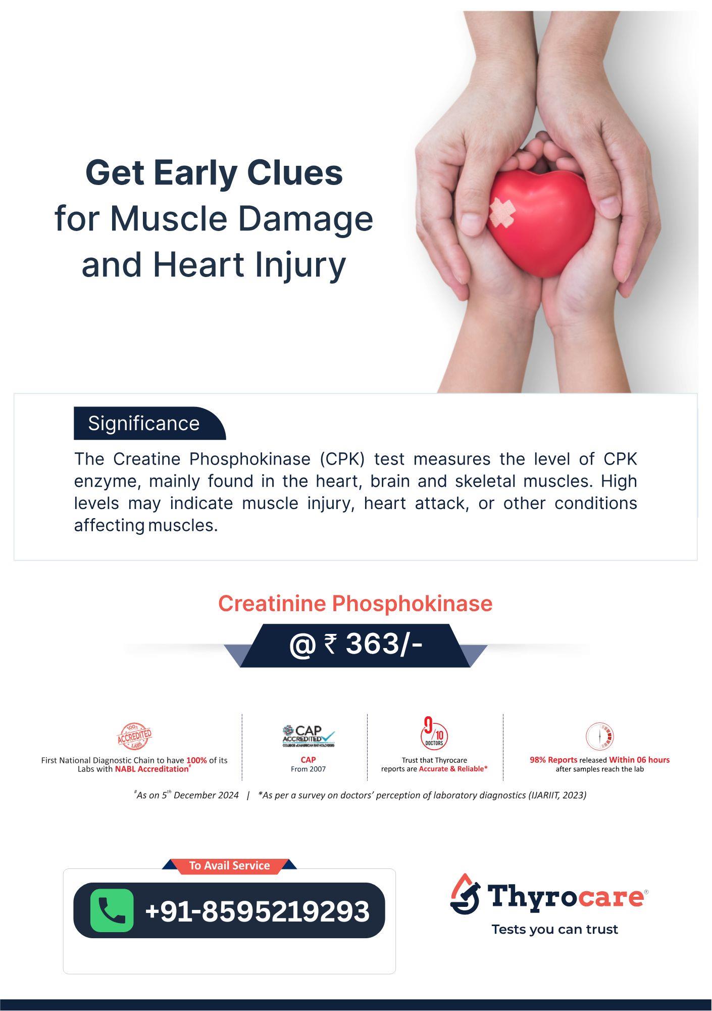 The Creatinine Phosphokinase (CPK) test measures the level of CPK enzyme in the blood, which is released from the muscles, heart, or brain when there is tissue damage. Elevated levels may indicate muscle injury, heart attack, or neurological disorders. Thyrocare offers this test for accurate evaluation of muscle and cardiac health. We at Bookmytest offers health checkup packages at a low price. Bookmytest offer free home sample collection.