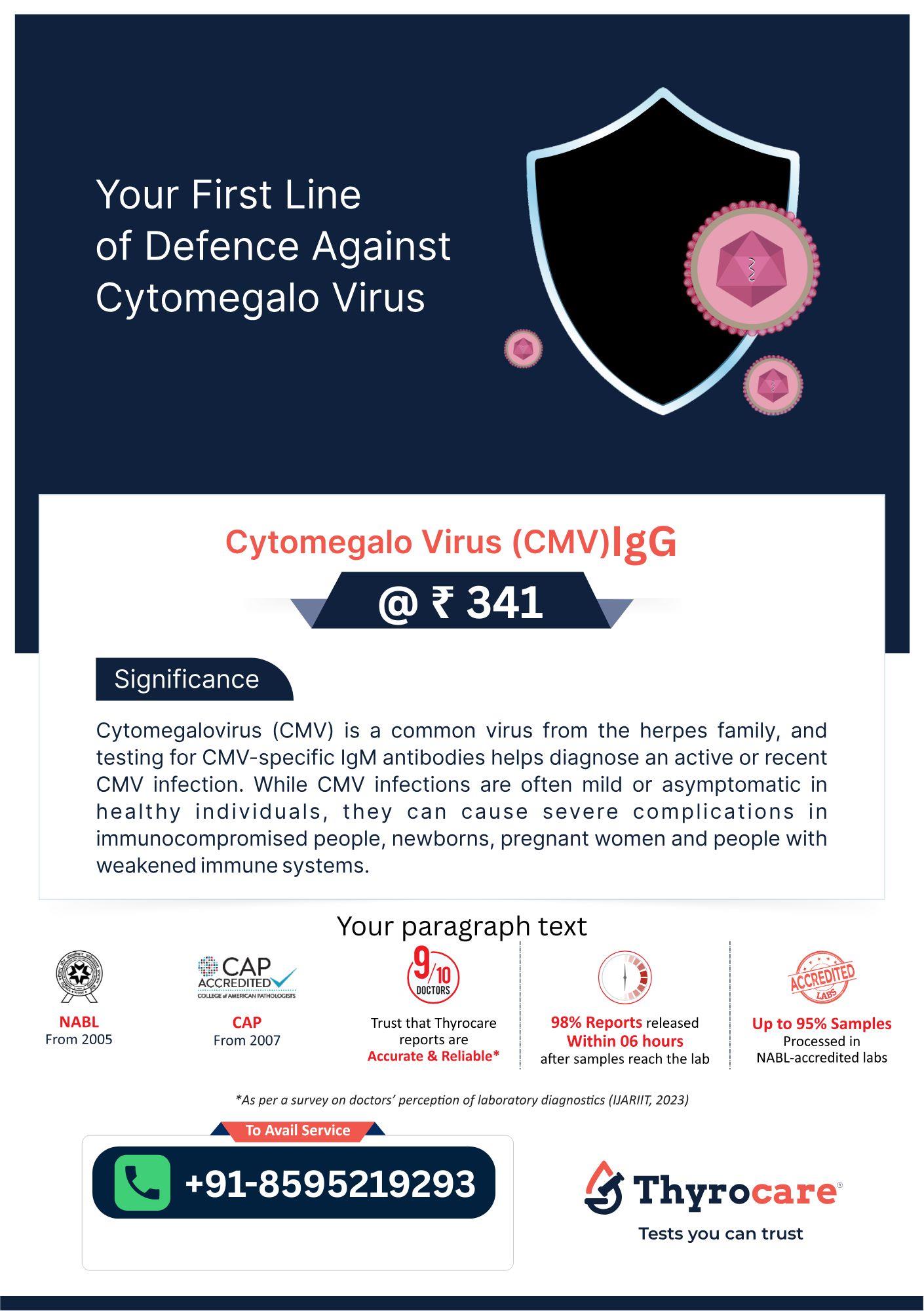 The Cytomegalo Virus (CMV) - IgG test detects IgG antibodies against CMV, indicating a past infection or long-term immunity. It is especially important for pregnant women and immunocompromised individuals to assess prior exposure. Thyrocare offers this test for accurate and reliable CMV screening. We at Bookmytest offers health checkup packages at a low price. Bookmytest offer free home sample collection.