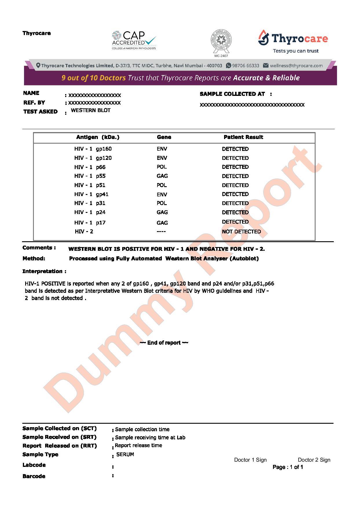 Thyrocare uses advanced Western Blot technology and follows stringent quality control protocols in NABL- and ISO-certified laboratories. The test is highly specific and reliable for confirming HIV infection, making it a trusted tool for diagnostic accuracy and peace of mind.