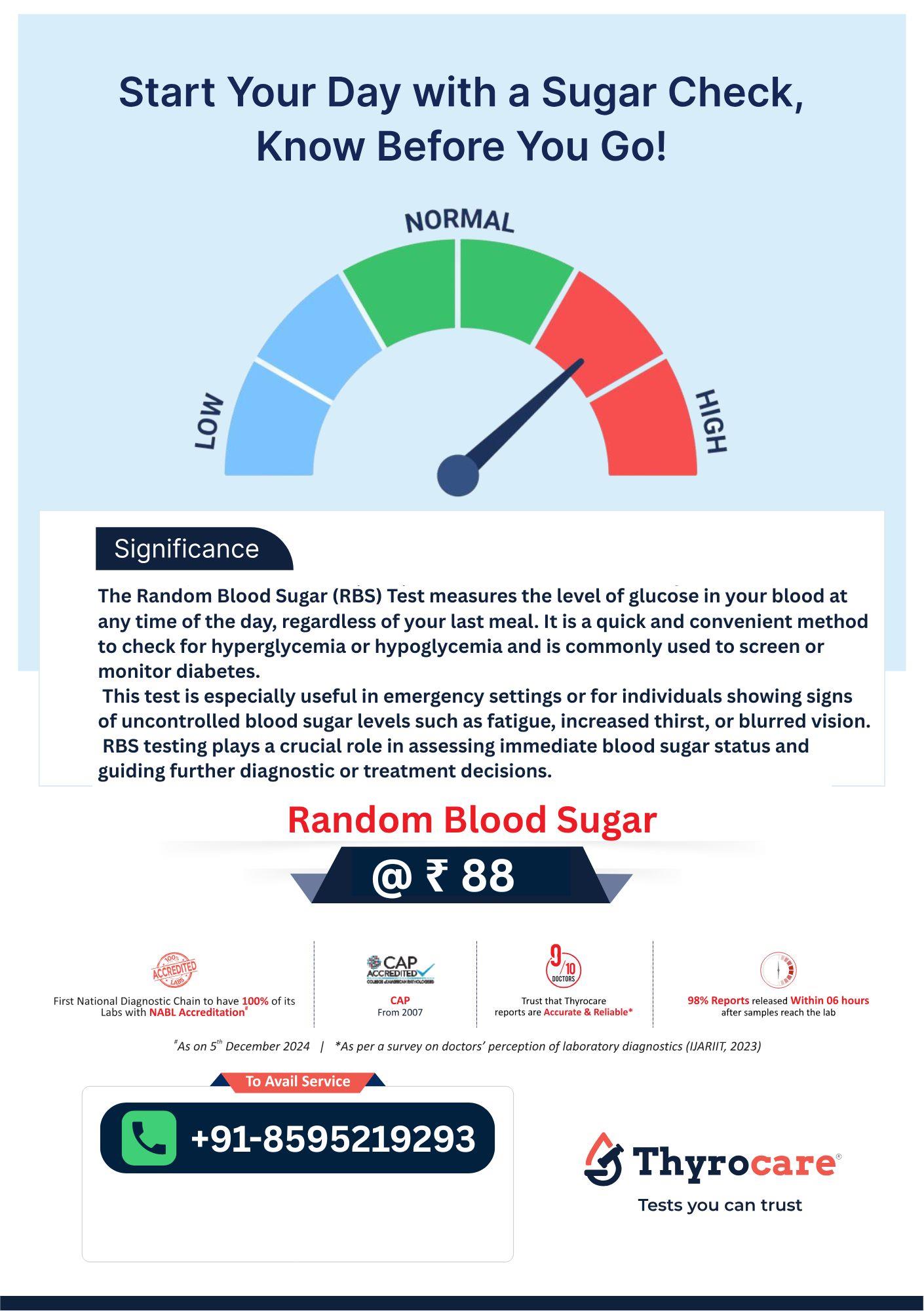 The Random Blood Sugar test measures blood glucose levels at any time of the day, regardless of when you last ate. It helps in the quick screening and monitoring of diabetes and other blood sugar irregularities. Thyrocare offers this test for convenient and reliable blood sugar assessment. We at Bookmytest offers health checkup packages at a low price. Bookmytest offer free home sample collection.