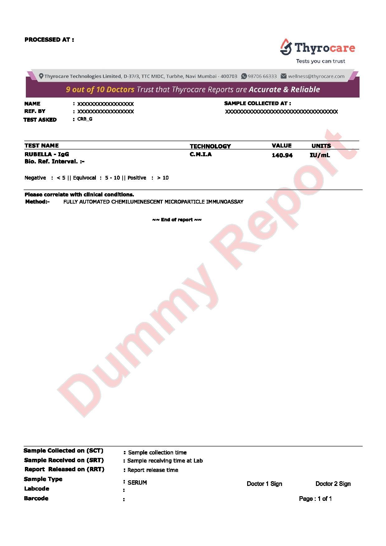 Thyrocare uses advanced immunoassay technology and follows standardized lab protocols to ensure accurate detection of rubella immunity.